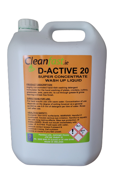 This is one of the most efficient washing up liquids available on the Irish market. This product breaks grease, food, fats and other residues instantly. It will reduce the level of scrubbing required to achieve amazing results and it will not generate a lot of foam. It can be used for domestic washing up, floor cleaning projects, car washing, wall washing, window cleaning and much more. It can be used on any washable surface. Many commercial kitchens use this high-quality washing up liquid as their main cleaning product. Cleanfast D-Active 20 Washing Up Liquid is tough on dirt but gentle on your skin.