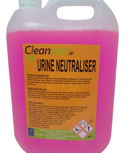 Our Cleanfast Urine Neutraliser / Artificial Grass Urine Neutraliser is the perfect treatment for outdoor urine odours. The product can be used on all external walls, patios, footpaths, astro floors, rubber floors, artificial grass, natural stone floors, etc. It starts working within minutes and it will get rid of all types of urine & pet odours. Unlike other types of urine neutralizers, our Cleanfast Urine Neutraliser / Artificial Grass Urine Neutraliser requires a dilution of 1 to 50, so it is much more cost effective and much more affordable. As effective on human and pet urine. It can also be used on public bathroom floors to get rid of bad urine odours. A proper heavy duty urine neutraliser manufactured in Ireland.