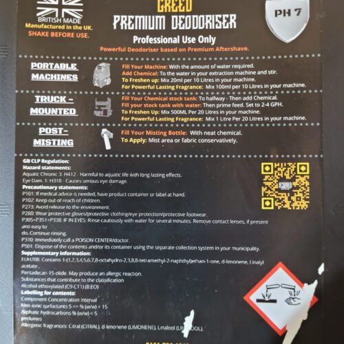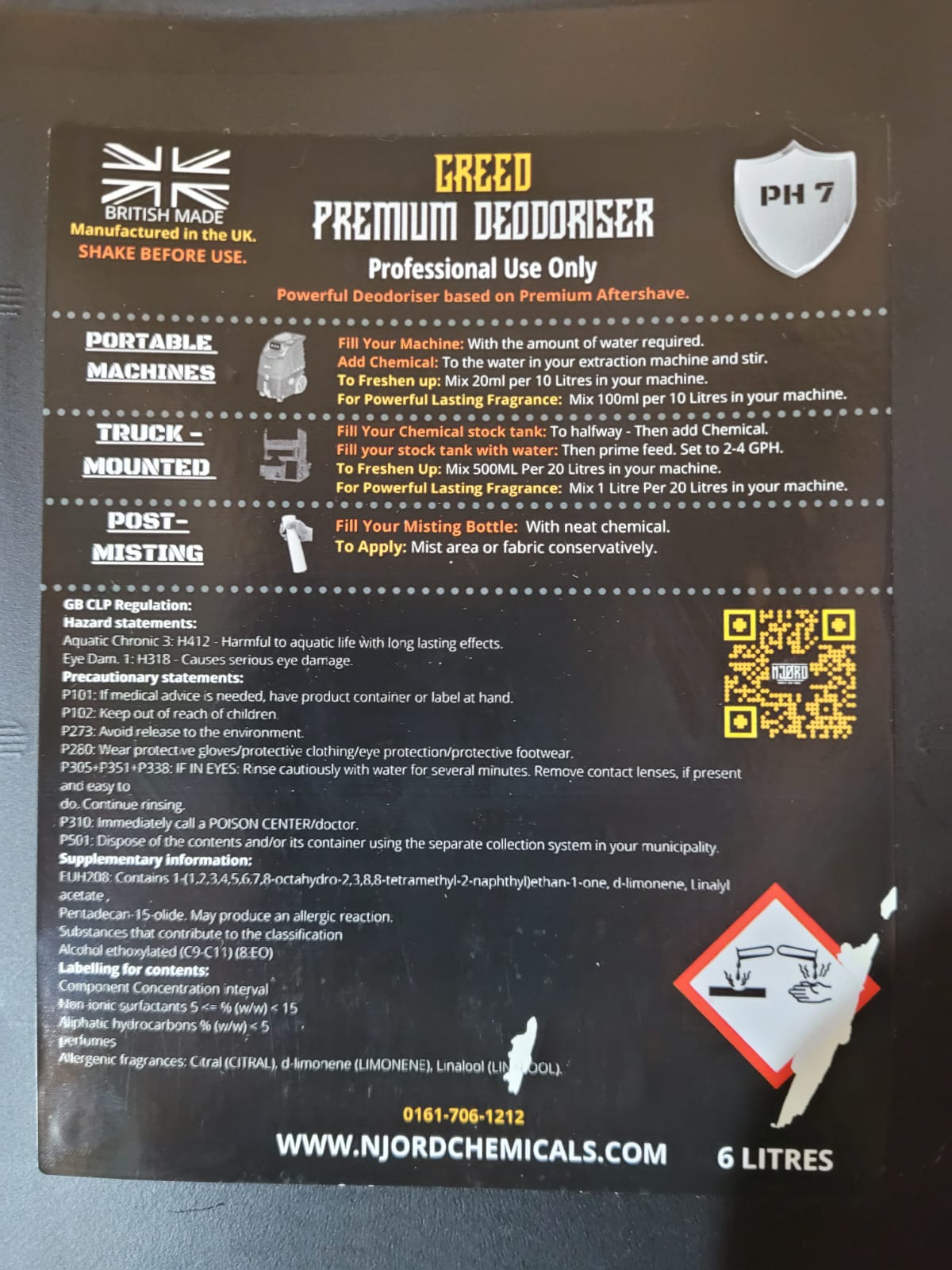 The product is highly concentrated and it has to be diluted. The product can be used as an additive to a pre-existing cleaning solution to transform that cleaning solution into a deodoriser or an odour neutraliser, or it can be used on its own, diluted, as a treatment directly on the affected area. Add about 150 ML of the new Njord Creed Premium Deodoriser into 1 L of clean water and use the mixture to treat surfaces that are affected by bad odours. Add about 1 L of the new Njord Creed Premium Deodoriser into your cleaning solution tank and wash your carpets or sofas as usual. By doing so, you will deep clean and deodorise all your carpets in one step.
