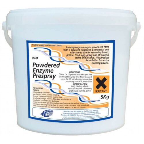 By using this high quality pre spray treatment and stain remover your job will be completed faster and with better results. Your reputation will go through the roof and your company will succeed where others have failed. Craftex Powdered Enzyme Prespray 5Kg is a highly concentrated product that should last you for months.