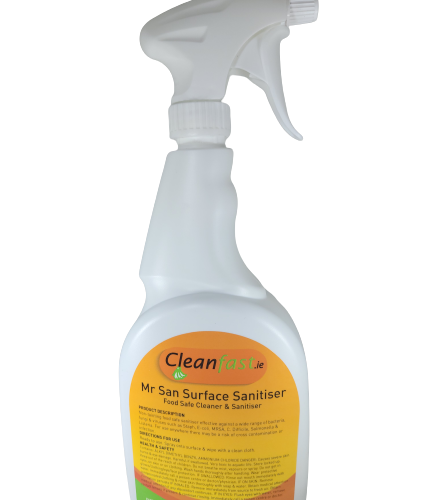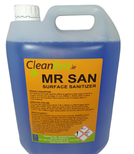 Cleanfast Mr San Surface Disinfectant is one of the most efficient surface disinfectants in Ireland. This product is manufactured in Ireland for the Irish market. Affordable, efficient and very cost effective. Give it a try and become one of our customers.