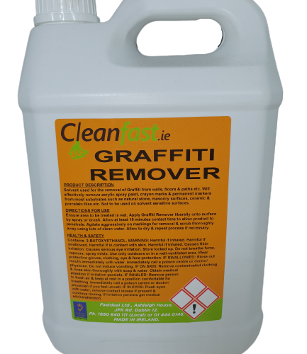 If you are tackling a large graffiti area we recommend that you order a small spray bottle and try it out. Some of the new spray paints are permanent and nothing will remove them. Do not mix up a number of graffiti removers to avoid reactions and use hand protection at all times. Our graffiti remover is manufactured in Ireland.