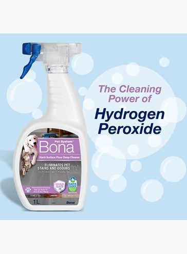 Even better, the new Bona Pet System Hard Surface Deep Cleaner 1L can extract dirt and residue from deep inside the fiber of the floor or from the grout lines. It cleans quickly and it leaves the surface spotless and odour free. A hydrogen peroxide based oxy power floor cleaning spray from Bona.