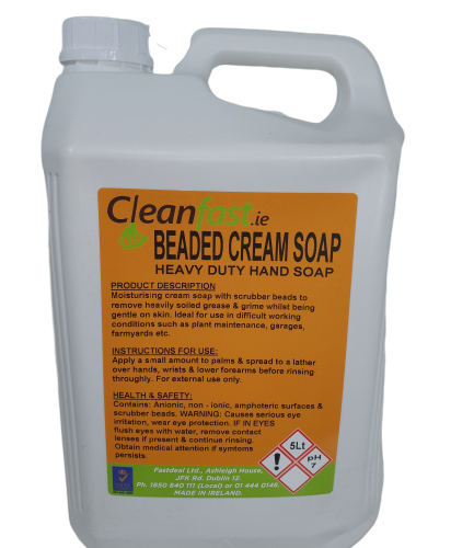The new Cleanfast Beaded Cream Soap is a heavy duty commercial and industrial beaded hand soap that is widely used on building sites and in garages, factories, warehouses, mechanics & all types of industrial use. The product’s main advantage is the fact that it contains thousands of small rough particles that helps the user scrub and agitate heavy duty dirt from hands. Its powerful degreasing qualities plus the advantage of its beaded particles, have made the new Cleanfast Beaded Cream Soap one of the most widely used and loved beaded hand soaps in Ireland. Suitable for hand washing only. Suitable for external use only.
