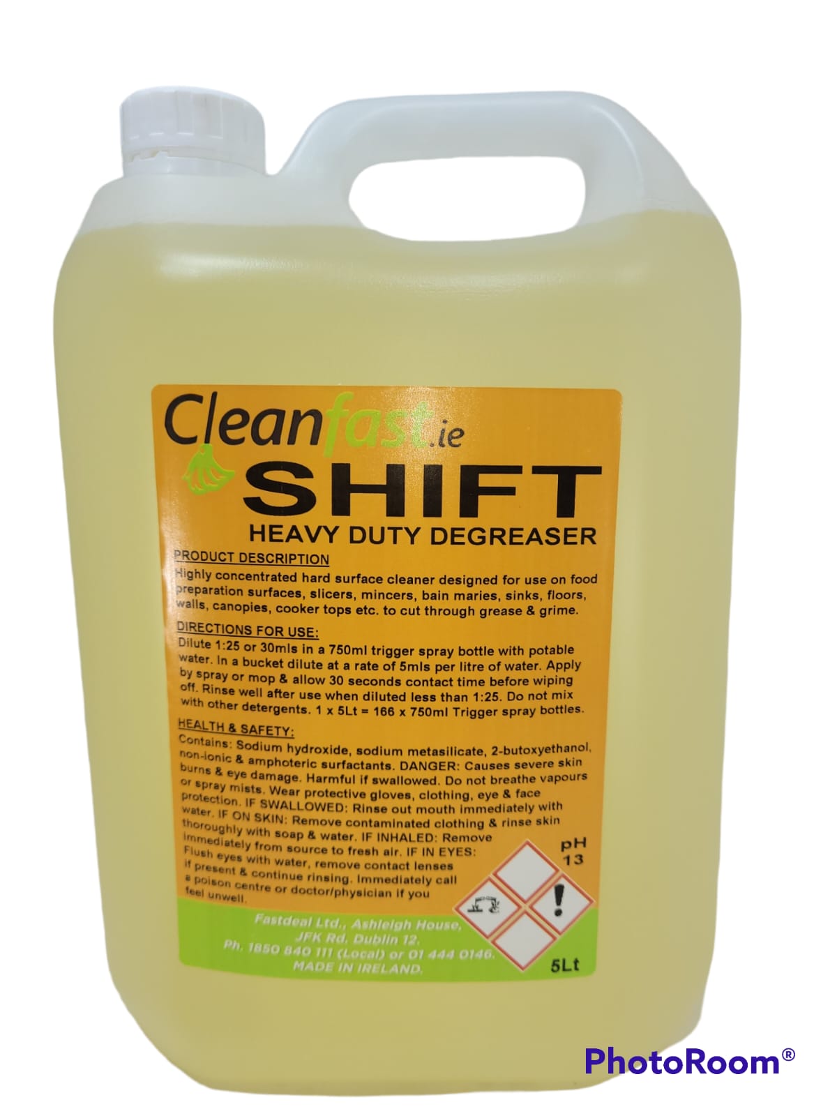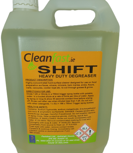 Cleanfast Shift Degreaser is a heavy duty degreaser and oil stain remover. It can be used for deep cleaning catering floors, worktops, ovens, canopies, extractor fans, walls, tiles, plastic fittings, etc. The product is highly effective and suitable for heavy duty commercial kitchen cleaning projects. It requires dilution in warm water before use. This is one of the most efficient and powerful degreasers available in Ireland. Some badly affected areas might require pre-soaking for a short period of time to help remove grease deposits.