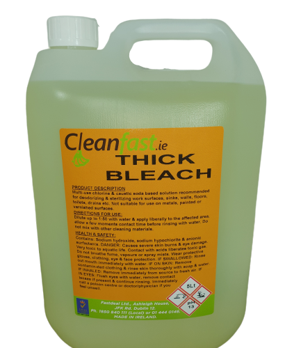 You cannot use this highly efficient thick bleach on polished or sealed surfaces. You cannot use our thick bleach on painted or varnished surfaces. Cleanfast Thick Bleach Extra can be used for general cleaning and maintenance of bathrooms and washrooms. You can use it in conjunction with a cotton mop or with a spray bottle. Dilute the product 1 to 200 for daily floor mopping and maintenance. For heavy duty cleaning you will have the dilution rate to 1 to 10 or less. If you need to disinfect dirty mops or cloths, please add about 100 ml of bleach over 10 l of water and allow it to soak overnight. For daily floor washing please add 50 ml of thick bleach over 10 l of warm water and mop your floors as usual. If you need to deep clean or descale heavy duty build ups, you will need to apply the bleach over the whole area and allow time to work. Never ever mix Cleanfast Thick Bleach Extra with other cleaning products. Never ever mix Cleanfast Thick Bleach Extra with boiling water. The fumes can easily knock you out.