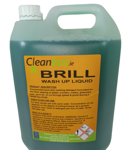 Soft washing up liquid suitable for manual washing of dishes, glasses, pots, crockery, etc. It will clean with ease and it will leave streak free surfaces. Cleanfast Brill Washing Up Liquid 5L can be used in commercial and domestic kitchens. Affordable, long lasting & cost effective. Powerful degreaser and fat remover. Many commercial kitchens are using Cleanfast Brill Washing Up Liquid 5L to clean worktops or to maintain kitchen fittings and floors. It provides outstanding results on safety floors or anti slip surfaces. Very soft on skin. Irish manufactured.