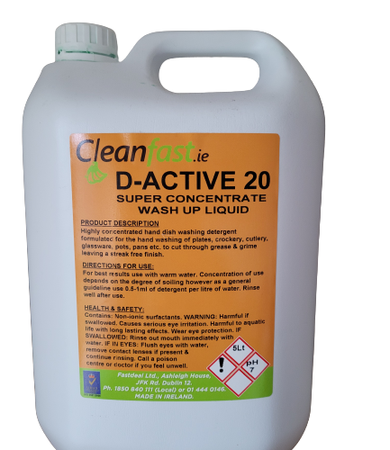 This is one of the most efficient washing up liquids available on the Irish market. This product breaks grease, food, fats and other residues instantly. It will reduce the level of scrubbing required to achieve amazing results and it will not generate a lot of foam. It can be used for domestic washing up, floor cleaning projects, car washing, wall washing, window cleaning and much more. It can be used on any washable surface. Many commercial kitchens use this high-quality washing up liquid as their main cleaning product. Cleanfast D-Active 20 Washing Up Liquid is tough on dirt but gentle on your skin.