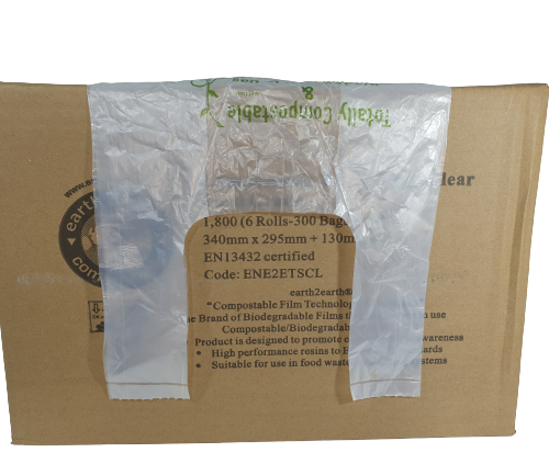 Top quality 100% compostable and biodegradable t-shirt bags. Suitable for commercial and domestic use. Highly popular with market stalls, vegetable shops, butchers, pharmacies, food shops, retail, etc. Suitable for multiple uses. Much better quality than similar products available online. The bags are fully EU certified (EN1342) and comply with all Irish legislation. Available in rolls of 300 bags or in boxes of 6 rolls (1800 bags per box). The bags are clearly labeled with the Earth2earth logo and marked as compostable & biodegradable.