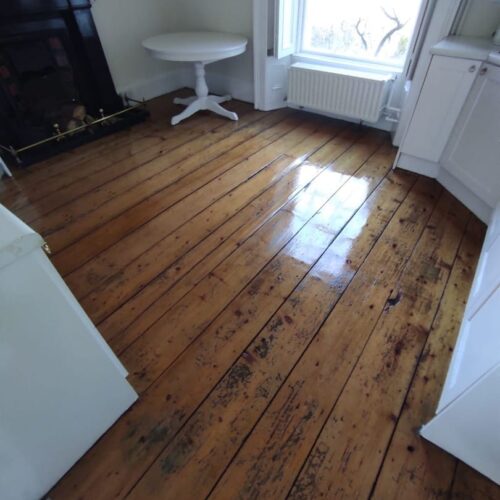 - Apply the first coat of floor lacquer, allow to dry, quick sanding & then more coats